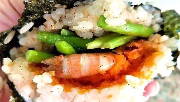 有日本飯糰的外型,使用柴魚、芝麻攪拌著白飯,配料有著新鮮的蝦、蝦卵,還有脆脆的蘆筍打造多層口感!