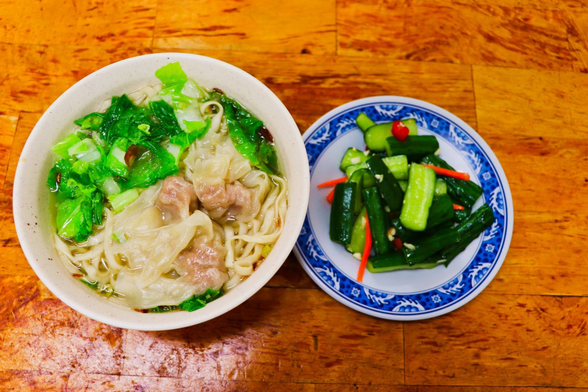 配料的小白菜量也不少,跟陽春麵是很搭的夥伴。麵送上來的當下就聞得到撲鼻的古早味代表-油蔥酥的香氣,有了對味的油蔥酥湯頭絕對就有保證啦!最後配上一點點的芹菜提味,湯喝完不會有很口渴的感覺喔!簡單的古早味應該就是這碗餛飩麵的最佳寫照了。