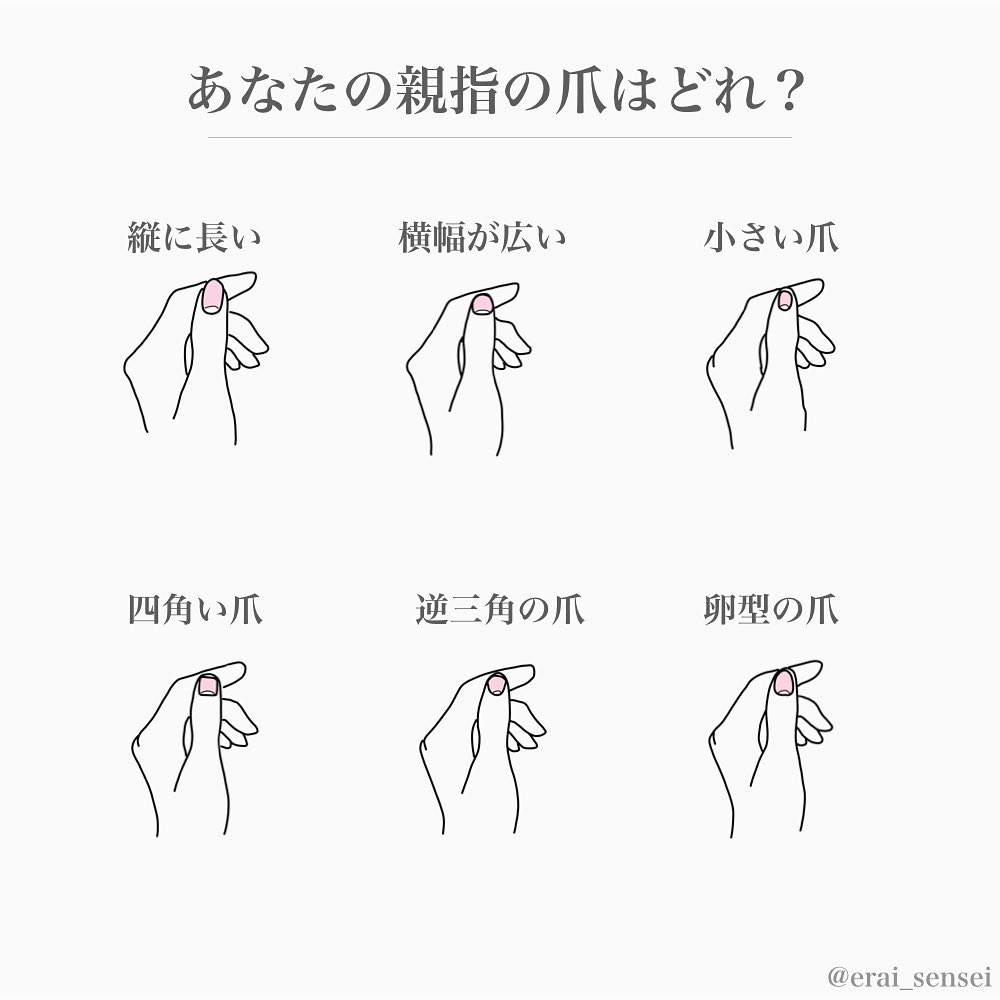 日本作家えらせん(Instagram@erai_sensei)整理出6種「大拇指指甲心理測驗」,從指甲的形狀就能看出你的內在性格。