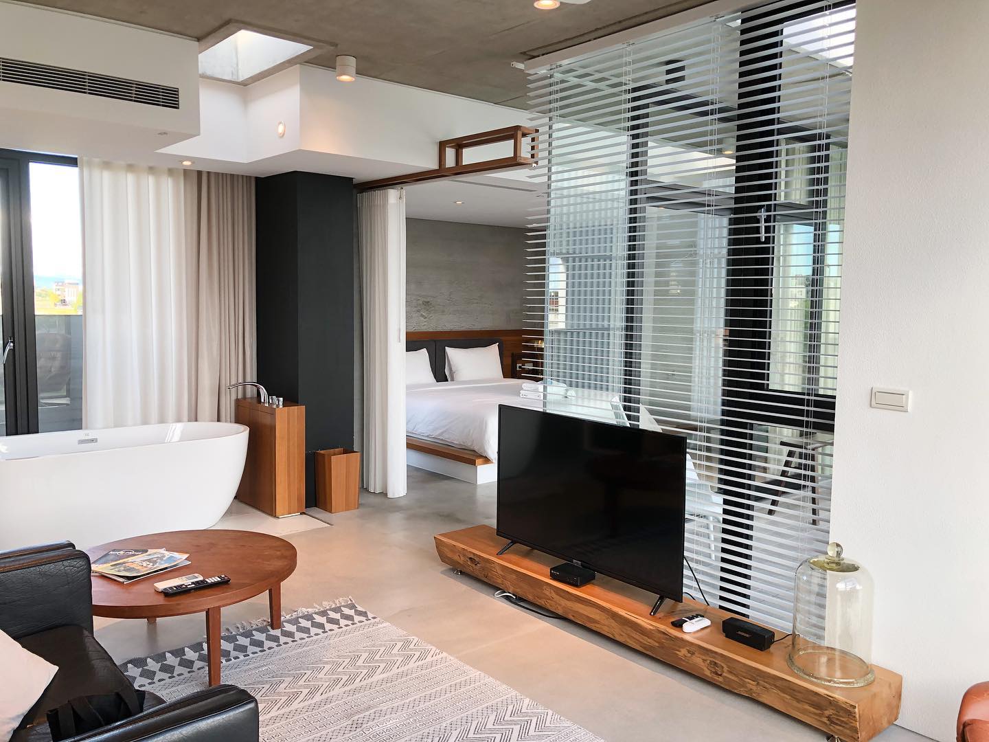 看似冰冷的灰色建築被落羽松圍繞,13棟工業風VILLA各自獨立,靜靜坐落在座落於稻田與河堤間,「二十輪Villa宜蘭館」採專業飯店式服務,室內的清水模裝潢在光線折射下,帶給人一種質感氛圍, 每一棟最多可以容納8個人,適合較小團的出遊團入住。