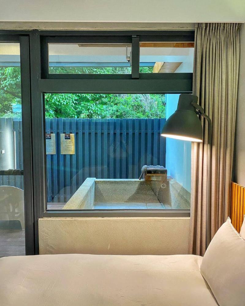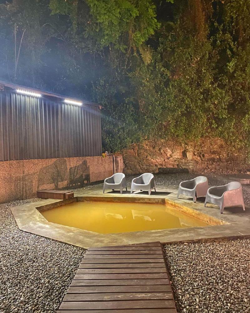 清水模和木質為設計基礎,山下的厝溫泉民宿部分房型有半露天溫泉池,另有一個需穿泳衣的露天大眾溫泉池,泉質皆是含鐵的碳酸鹽泉,也就是傳說中的「黃金湯」,含鐵的透明無色溫泉水和空氣接觸後鐵質氧化,逐漸轉變為黃色,礦物質結晶漂浮在水面上,又被稱為「溫泉花」,露天的大眾溫泉池雖然不大,旁邊擺了幾張簡單的椅子,但在星空下泡溫泉是個很棒的體驗!