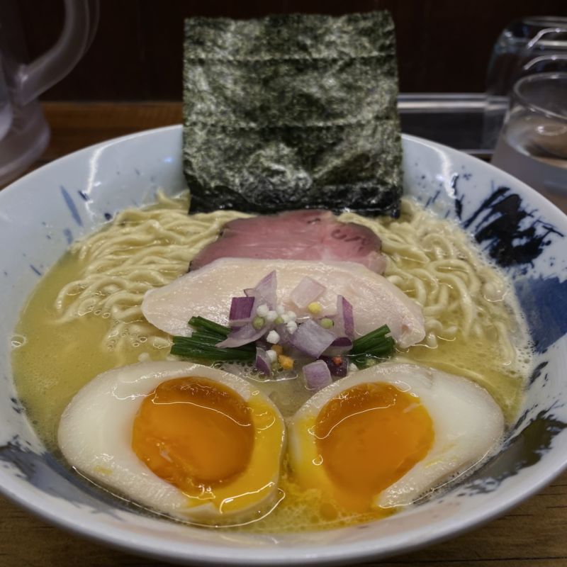 以濃郁的雞白湯為底,濃稠的金黃色雞湯帶著些許的膠質感,配料部分有舒肥過後粉嫩的雞胸及雞腿、鮮蔬及煮的恰到好處的的溏心蛋,偏硬的麵條沾附了滿滿的湯汁,讓人忍不住一口接著一口!另外店裡的牛舌及牛肉可麗餅也絕對不能錯過!
