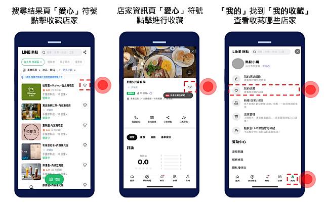 現在都不用了!LINE熱點全新功能「我的收藏」上線了,在「搜尋結果頁」或是「店家資訊頁」看到喜歡的店家,只要輕鬆點一下右側的❤符號,就把你的愛店通通收納起來了!