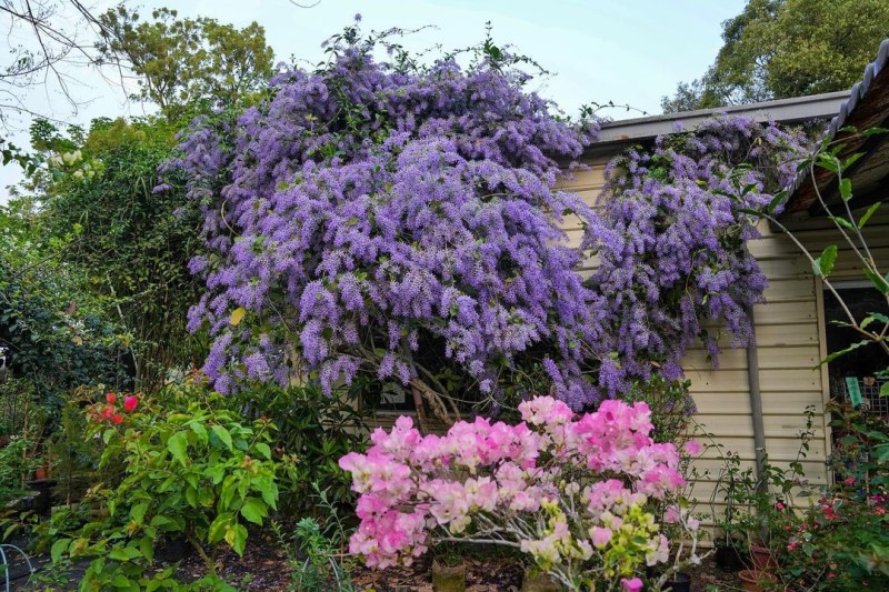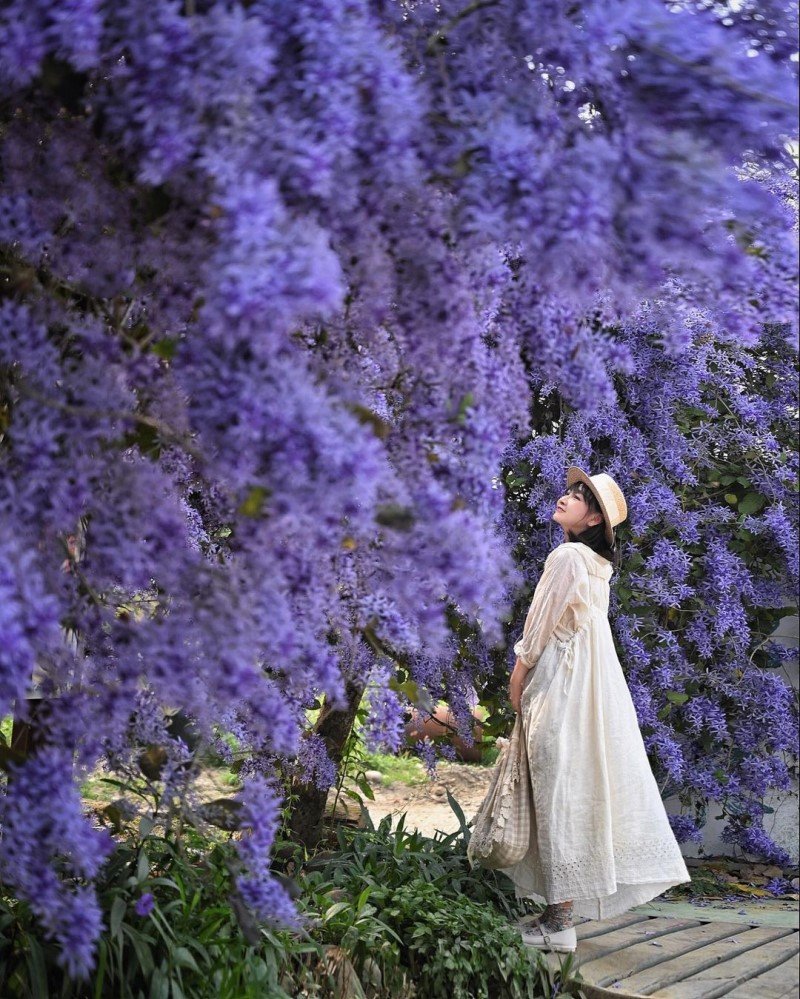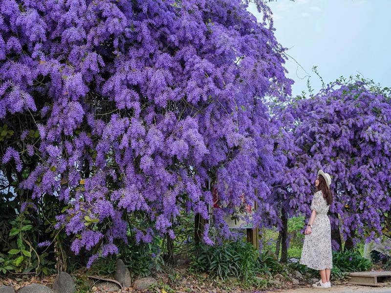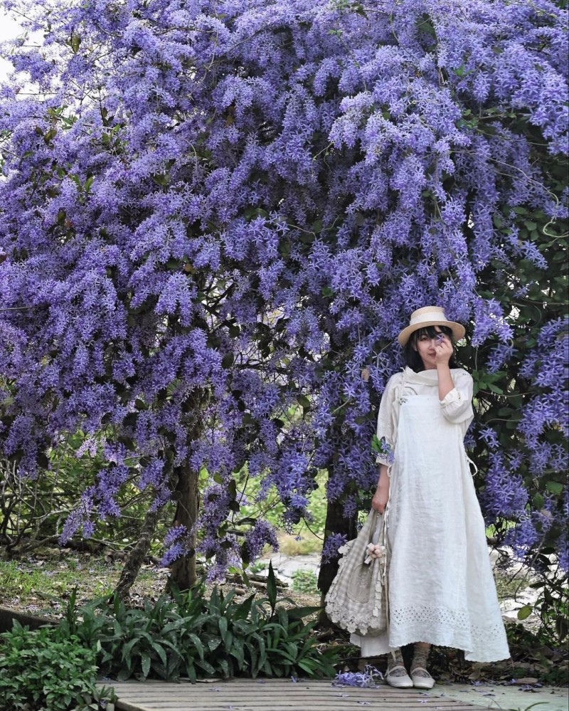 春季在全台各地都颳起一股紫色風潮,除了紫藤花盛開之外,與紫藤有點像的「錫葉藤」花海也已經滿開炸裂,五片花瓣組成一串的花串,目前正值最佳觀賞期,滿開時像是瀑布一樣傾瀉而下超夢幻,快把握花季來賞美景。