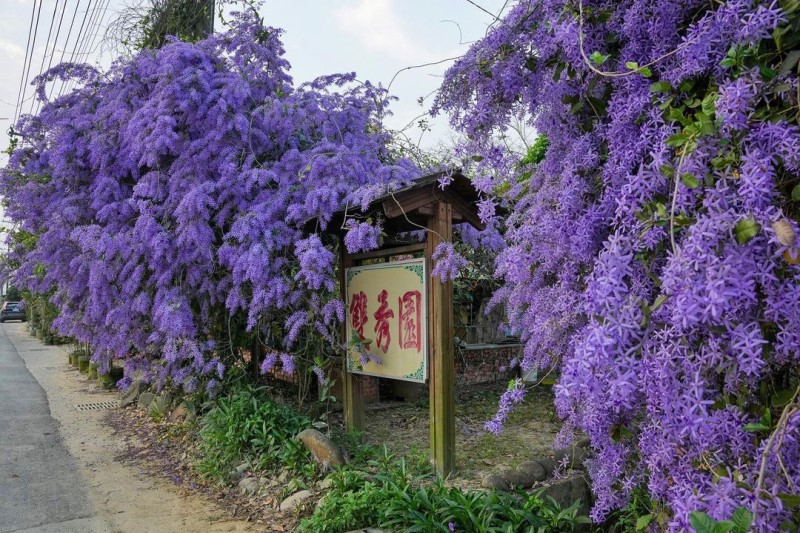 位於台南玉井區的「雙秀園」每年花季時,門口的錫葉藤便會綻放夢幻的紫色花串,是南部知名賞錫葉藤景點,近期天氣良好也讓花況爆量盛開,2大團紫爆的錫葉藤花團吸引許多人前來賞花,站在一大片錫葉藤花瀑布前拍下美照彷彿置身仙境。