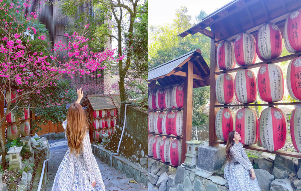 一棟棟日式建築在街道兩旁、一顆顆紅色燈籠為行走的路人照明腳下道路,短短十分鐘的「明治溫泉老街」充滿濃厚日式氛圍,穿著浴衣穿梭在其中,凝視著遠方搭配著淡淡薄霧,一眨眼便形成了一幅美圖。