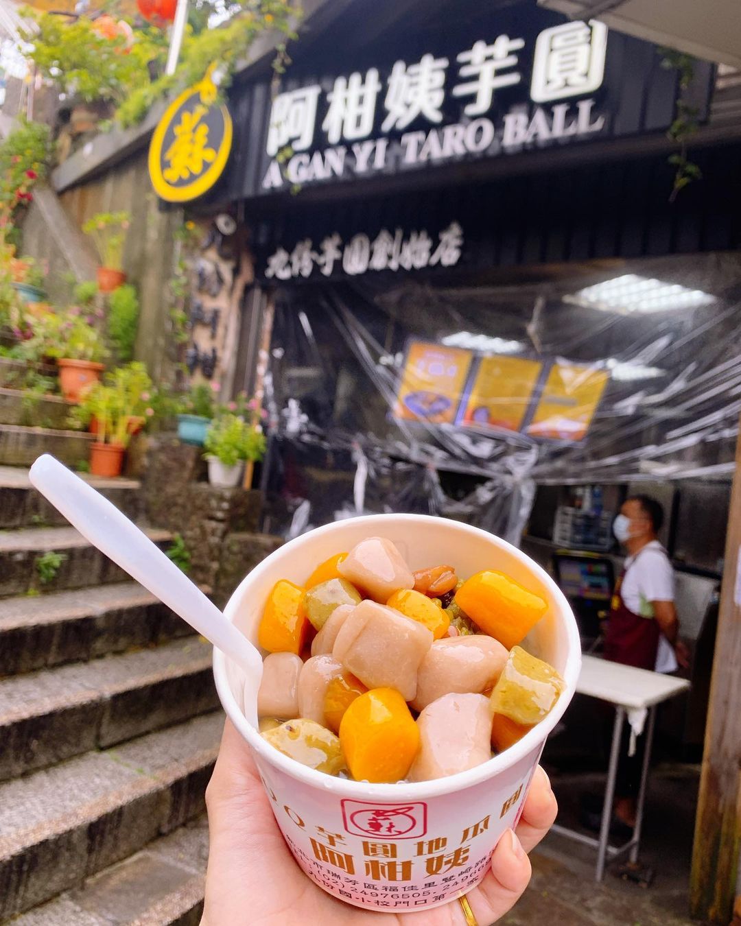 「阿柑姨芋圓」創立於西元1960年,至今已有60多年歷史,因店家地理位置在九份高處,一邊享用香甜地瓜圓、芋圓,還能邊欣賞九份薄霧繚繞的高空美景,十分清心~