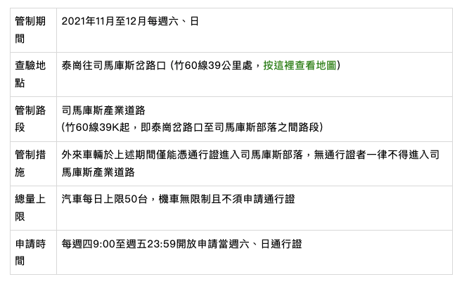 近年司馬庫斯已取消入山管制了,民眾不需申請登記入山證,隨時都能進出。不過近期受疫情影響,即日起至12/31止,因聯外道路路況和承載量有限,假日需要總量管制,每日限50輛汽車,假日想前往司馬庫斯的朋友,可要事前預約取得通行證,機車則是沒有限制也不須申請通行證。
