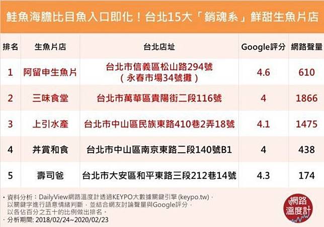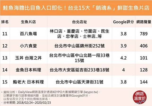 生魚片料理何其多,你最愛哪間?DailyView網路溫度計就透過《KEYPO關鍵字搜尋引擎》,觀察網友在臉書討論、PTT與各新聞媒體、討論區的留言,加上Google網友評比平均分數找出熱門餐廳TOP14,你的愛店有上榜嗎?還是你又發現了新的口袋名單了呢?