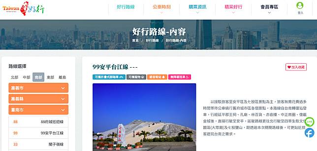 99安平台江線最大的特色就是以接駁旅客至安平區及七股區景點為主,旅客無需花費過多時間等待公車繞行舊府城市區各個景點。這個路線自台南轉運站發車,行經延平郡王祠、孔廟、林百貨、赤嵌樓、中正商圈、億載金城後,直接行駛至安平,延駛路線更往北行駛至四草生態文化園區(大眾廟)及七股鹽山,等於將安平主要景點都跑遍了,所以若是想規劃一趟安平深度旅遊,「台灣好行」會是不錯的選擇喔!
