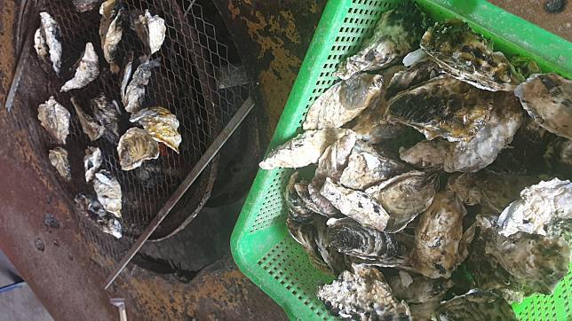 這裡的烤蚵吃到飽規則是吃完一籃再拿一籃,在竹筏遊程結束前桌上便已經預備好了升好火的炭爐以及一籃蚵仔,接下來就是看各家本事,能吃多少就拿多少囉!