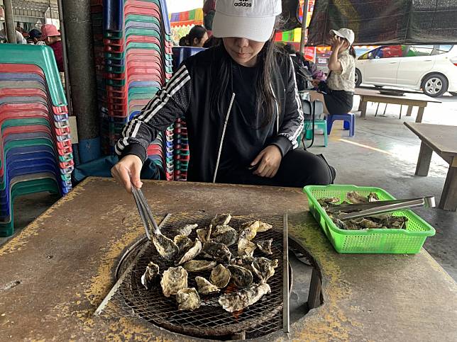很快地半小時又過,船停靠岸邊,接下來就是大家最最期待的烤蚵吃到飽行程啦!大家火速卸下身上的救生衣,四到八人一桌,圍成一圈就開烤了!這真的是相當歡樂的場面,看著大家大快朵頤,心情也跟著感染到那樣的歡樂氣氛,甚至還有別桌的遊客連啤酒都開了呢!現在(四月初)的蚵仔還不到最大最飽滿的時節,但因為新鮮,烤起來一樣的美味啊!