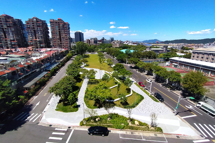 「松榮公園社區營造歷程」首次突破以往以地方需求為主的公民參與機制,廣邀專家學者、 NGO 組織、社區居民等意見,留設 80% 以上的大片綠地空間,減少非必要設施,並透過地形的變化與遠方大屯山景相互呼應。步道以瑠公圳流水的意象進行配置,交織於整體地形變化之中,提升公園景觀豐富性,建構人與自然的共融環境。