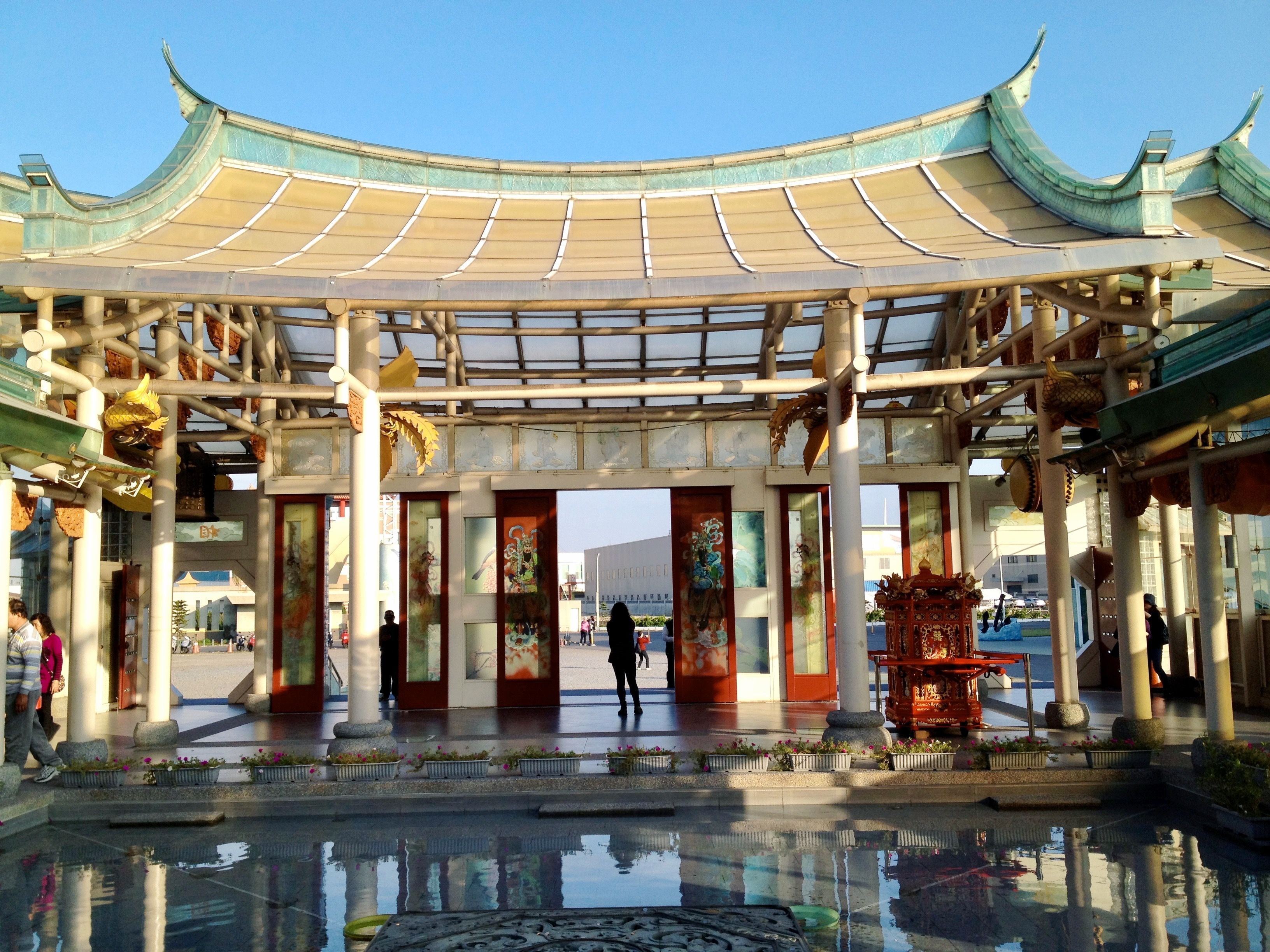 熱烈的陽光灑在玻璃媽祖廟,透進來的光穿越了七彩的玻璃,映照在整間寺廟裡,有一股強大的宏偉氣勢。