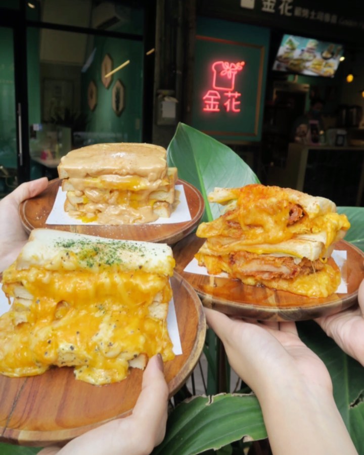 「金花碳烤土司專賣」位在西門紅樓後方,以超浮誇的視覺聞名,吸引不少國外觀光客慕名前來,最推薦店內招牌「給我壁咚」,使用手工牛奶吐司,夾層為軟嫩的半熟歐姆蛋與香氣十足的福源花生醬,雙色熔岩起司瀑布從吐司間大肆宣洩,起司控必點,超華麗的視覺與味覺饗宴,第一眼就收服她的心!