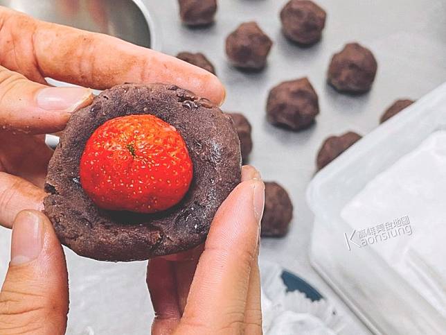 再手工一顆一顆的用麻糬皮包覆,滾成圓滾滾一顆顆排排站的草莓大福。不論內餡或外皮都減糖過,外皮綿中帶彈。