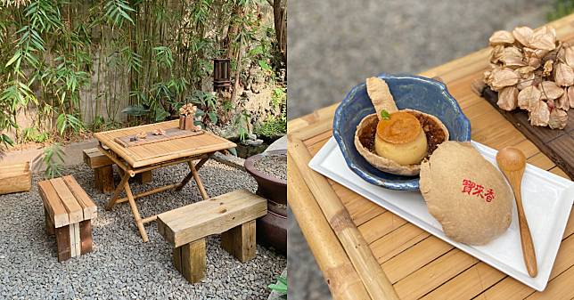 隱身於台南巷弄中的「水天」,是一間由老屋改建的日式茶屋,店內除了保有過去老屋的斑駁感,也擺設了許多老闆收集的古物;半露天的空間,讓客人能一邊聽著流水聲,一邊感受古色古香的老屋氛圍。菜單上的餐點以套餐為主,提供一種茶搭配一份小點,而餐點的名稱也是極富禪意,像是「若竹」就是以文山包種茶,搭配創意的椪餅布丁,將椪餅挖空當作容器,承裝整顆布丁,浮誇療癒的造型,成為店內的熱門打卡餐點!