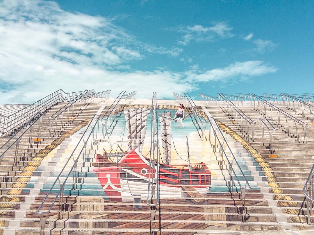一艘大船竟然就這樣開上階梯?!館外的3D彩繪階梯以「大船入港」為主題,就像是要載著大家一 起登上考古船。爬上階梯則可以登上瞭望台,遠眺整個台北港。
