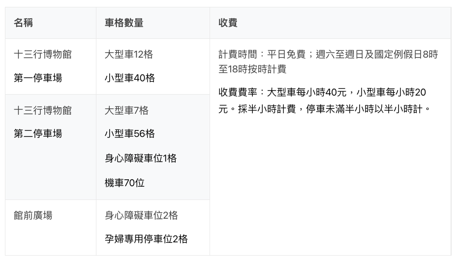 開車自駕前往十三行博物館的捧油們,由於博物館館區本身就規劃有兩大區域停車場,而且依規定設有親子友善停車格,所以帶小孩出遊的爸媽們完全不用擔心停車問題喔!小編幫大家整理了週邊的停車資訊如下:
