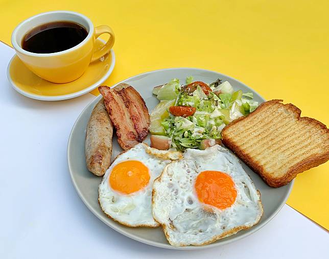 當香噴噴的布里歐吐司,熱騰騰上桌時,配著厚培根與太陽蛋一口吃下,接著繼續享用著淋著百香果優格醬的生菜沙拉(圖片提供/光一肆號)