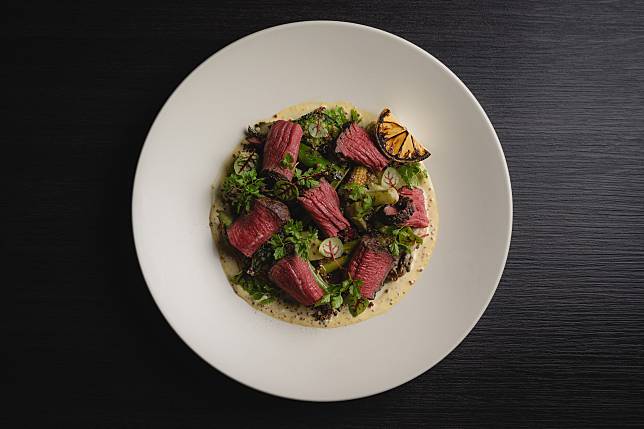 選用菲力部位,經龍眼木直火燒烤,散發特有煙燻香氣,三分熟肉質呈現紅寶石般美麗色澤,柔嫩燻香,搭佐酸香微嗆的柚子芥末醬,白花椰泥、藜麥及各式時蔬增添口感層次。(圖片提供/WILDWOOD)