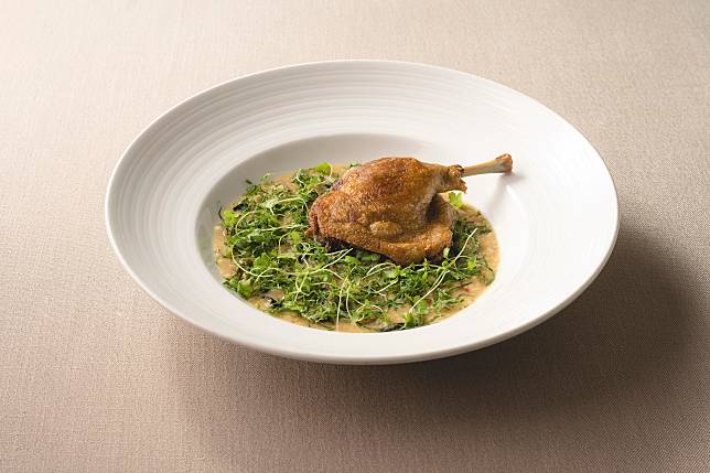 遵循傳統工序長時間醃製鴨腿極低溫慢烤,呈現表皮酥香肉質軟嫩的鹹香滋味。(圖片提供/Chou Chou)