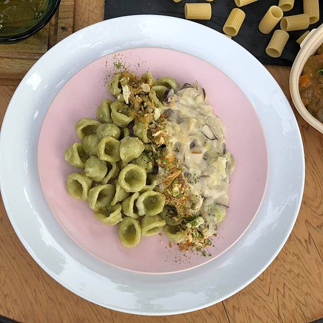 炒香群菇奶醬與自己做綠茶貓耳朵麵(圖片提供/湖畔生活)
