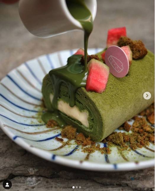 抹茶爆漿毛巾卷的部分,是外層由千層屏皮包覆抹茶醬,內層則是抹茶牛奶醬,一刀切下就會立馬爆漿出來十分療癒,而且美味程度也是不在話下。訂購方式的話,店家會在臉書公布可訂購的組合及時間,偶爾也會在市集等等地方販售喔!