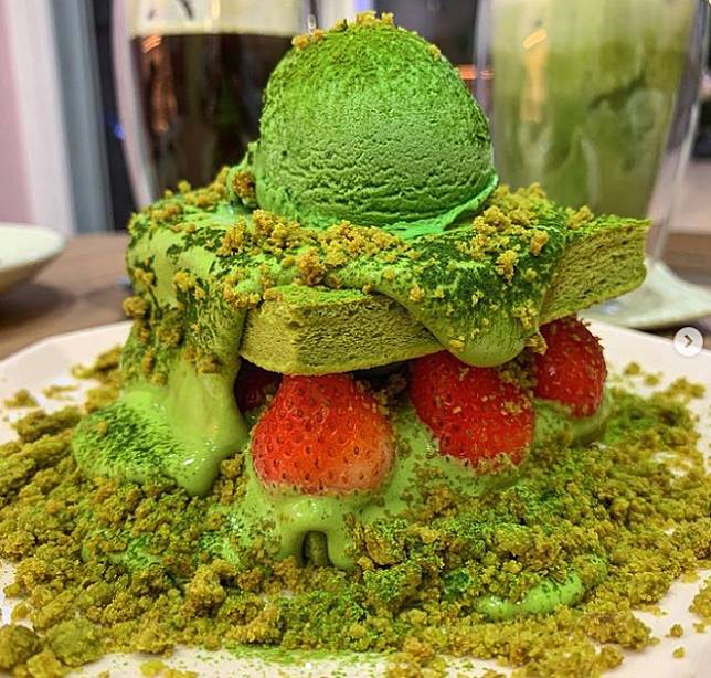 看看這澎湃的份量,真的是讓人食指大動!有著淡淡香氣的抹茶蛋糕,淋滿了抹醬再隨性的撒上微苦的碎餅乾來中和甜味,最後非常推薦再加上一球濃濃的抹茶冰淇淋,整體來說甜度很低所以完全不會膩,卻能讓你超有飽足感!