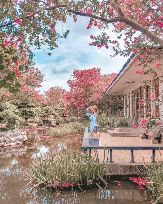 白色磚石造的茶館,佇立在水池內,池邊遍佈美麗的紫薇花樹,紫薇花色豔麗,花期從6月開至9月,因此有「百日紅」之稱,也是庭園造景最常種的植物之一,粉紅花開時節,站在這裡眺望滿園景色,也像處在小日本般的優美。
