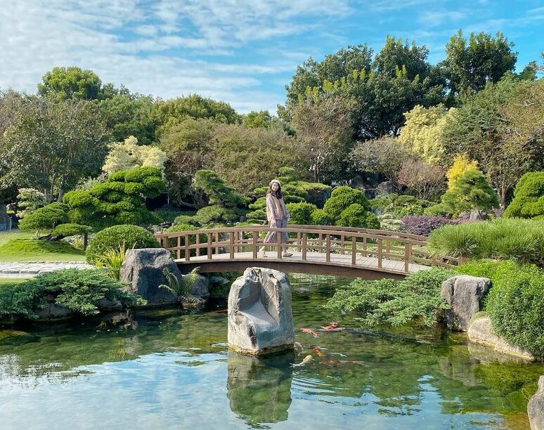 高大長青的松柏是日本庭園最喜愛種的植物,還有象牙樹、蘇鐵林、無憂樹等,池塘水流動,綠中點綴紅,修剪成圓長形狀的植栽,配上白色圓木柱,圓中有方,產生極簡的美感意象,時而可見優美盆栽,六角涼亭、石雕石椅。