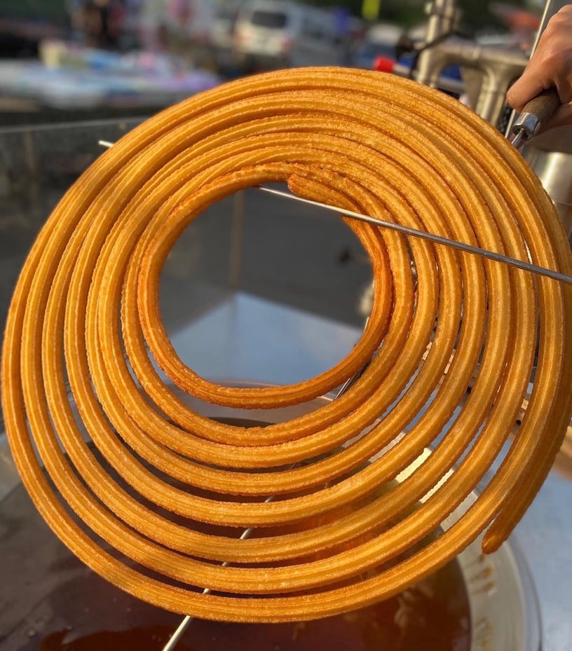 前陣子紅遍IG的巨大蚊香吉拿棒來啦!位於旱溪夜市裡的油吉條,以超大體積的蚊香式造型吉拿棒廣為人知,剛出爐的超浮誇模樣看的人人目瞪口呆,四溢的香氣也讓人口水直流~而這超巨大的吉拿棒竟然只要50塊就能買到,超親民的價格真的很難讓人不心動啊!