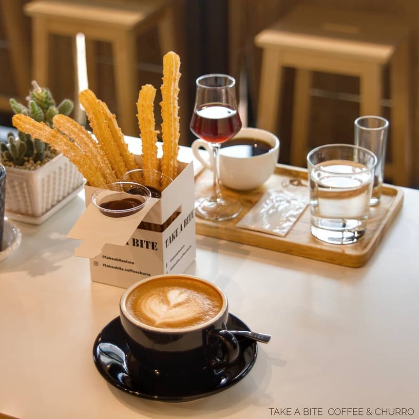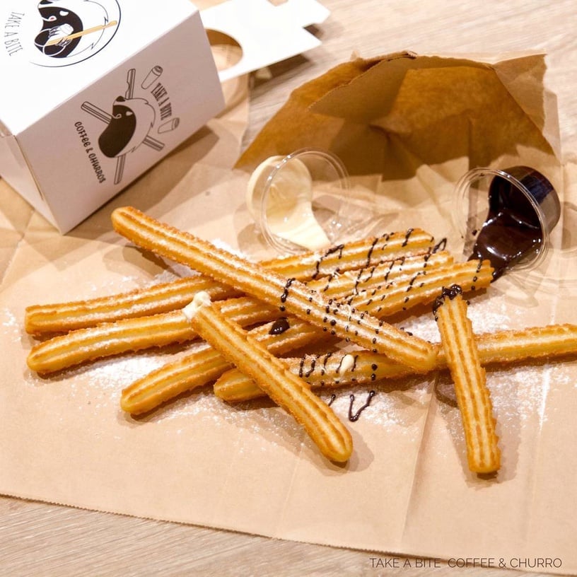 TAKE A BITE是間以吉拿棒為主角的咖啡廳,細長型的外表無時無刻都在勾動著饕客們的味蕾,光是糖粉就多達7種風味,沾醬更是有著10種選項,完完全全把吉拿棒吃出了精緻下午茶的高級感。