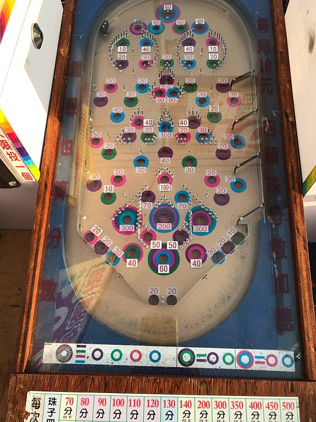 這是非常古早味的打彈珠換香腸活動,騎著一輛三輪車,一邊烤香腸一邊讓小朋友打彈珠的畫面深植在許多人的童年回憶中。店家採用的並非新式電子彈珠台,而是懷舊的彈簧手動彈珠台,這樣的彈珠台相當需要技巧與力道的控制,蠻幹般的打法是無法獲得獎勵的,然而筆者剛好只會用蠻力打彈珠,所以成功獲得了安慰獎糖果一顆。