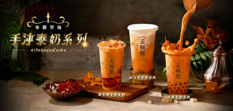 以茶起家的五桐號近日首推「手沖泰奶系列」不僅只有外觀上的吸睛,在推出後成功擄獲大眾的味。開賣後就引起搶喝風潮,首週就熱銷千萬杯!除了調配出號稱「超完美手沖比例」的泰式奶茶,近日推出新款,加入了五桐號的招牌配料,讓特殊的泰式濃醇風味也有料了!「珍珠手沖泰奶」加入代又蜂蜜的軟Q招牌白玉珍珠,「綠茶凍手沖泰奶」則是加入招牌台式手工凍,讓泰式奶茶多了一抹綠茶香。而五桐號泰奶系列成為大眾為之一亮的有料系奶茶,讓咀嚼控也獲得滿滿的享受。
