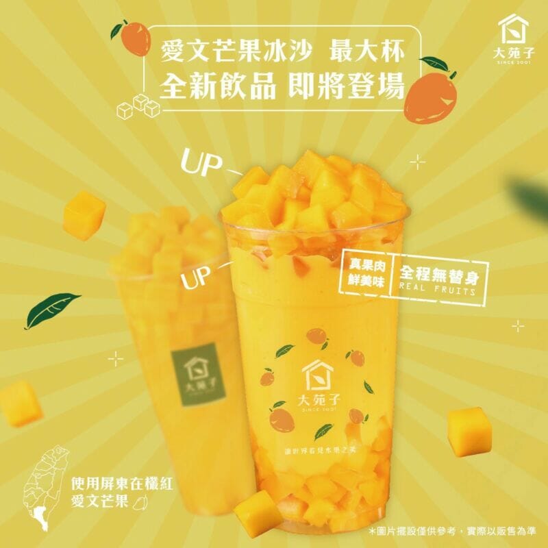 芒果旋風再來襲,最大杯愛文芒果冰沙就在大苑子!這次新品是含有1000c.c的超大杯愛文芒果冰沙,一杯就含有4顆以上的芒果,來自屏東枋山枋寮,真材食料、新鮮直送。滿滿果肉和濃郁芒果香的冰沙飲品,會是芒果控們的最佳解暑聖品!6/3正式上市,愛吃芒果的,不能錯過~