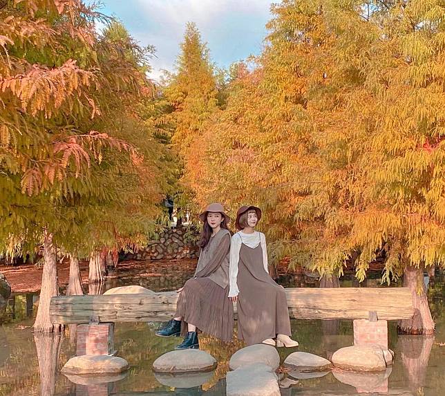 台北的落羽松美景十分難尋,而原住民文化主題公園的這裡的落羽松,不管怎麼拍都讓人眼睛為之一亮。正面拍人像,背面拍風景,落羽松搭配上忘憂湖,且湖面再把場景複製印上,拍照起來如同一幅畫作般存在。