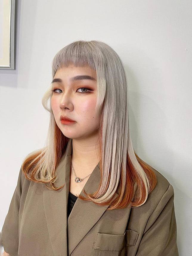 雪紡白金用了耳圈染+裙擺挑染肉桂橘X眉上瀏海,變身前衛的韓系冰山美人