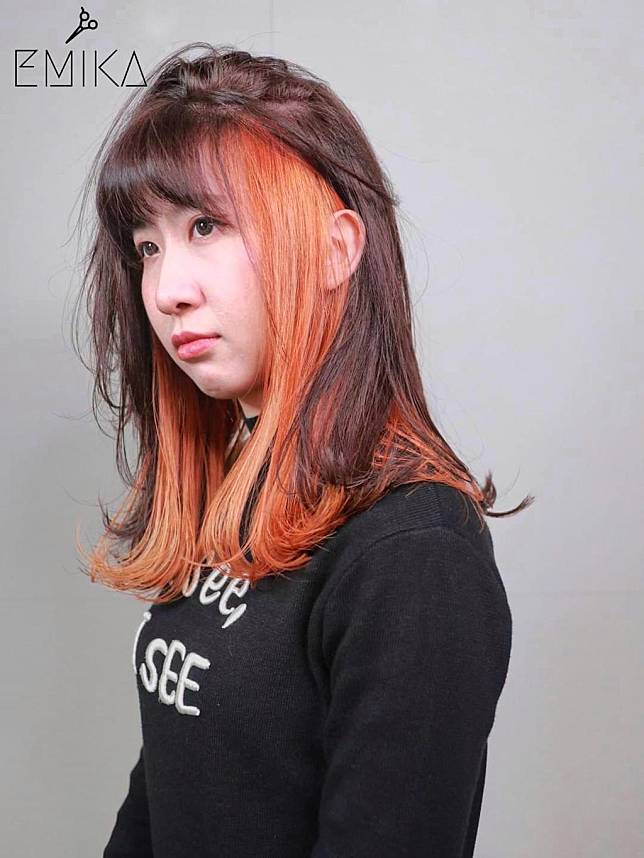 珊瑚橘髮色因KPOP女星們加持而大紅,但是真的很擔心會太高調~ 不打緊,那就用雙層染把亮色藏在內層,外層就用不可能會出錯的玫瑰深棕來平衡一下