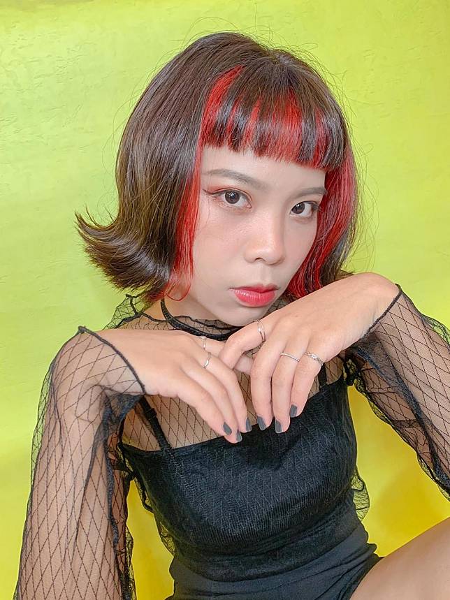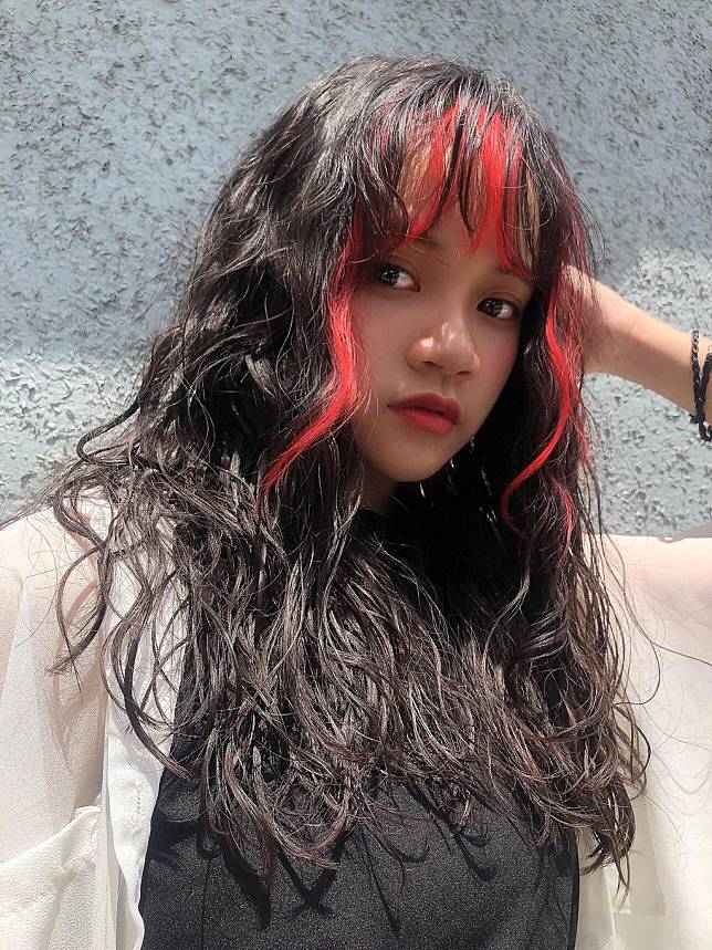 像這樣鮮艷搶眼的火燄紅,只挑染在瀏海以及耳邊兩撮,非常有畫龍點睛的作用,是不是比染整頭更搶眼呢