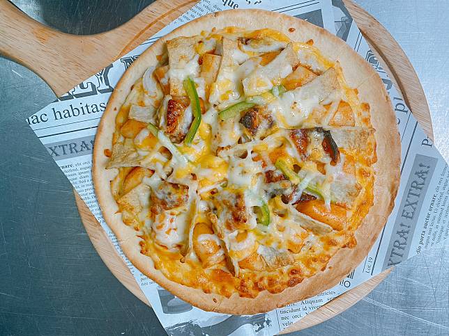 以熱銷第一名的起司辣炒年糕入料製成的韓式年糕披薩,酥脆餅皮搭上Q彈的韓式年糕,同時加上以辣醬醃漬的烤雞。(圖片提供/bb.q CHICKEN)