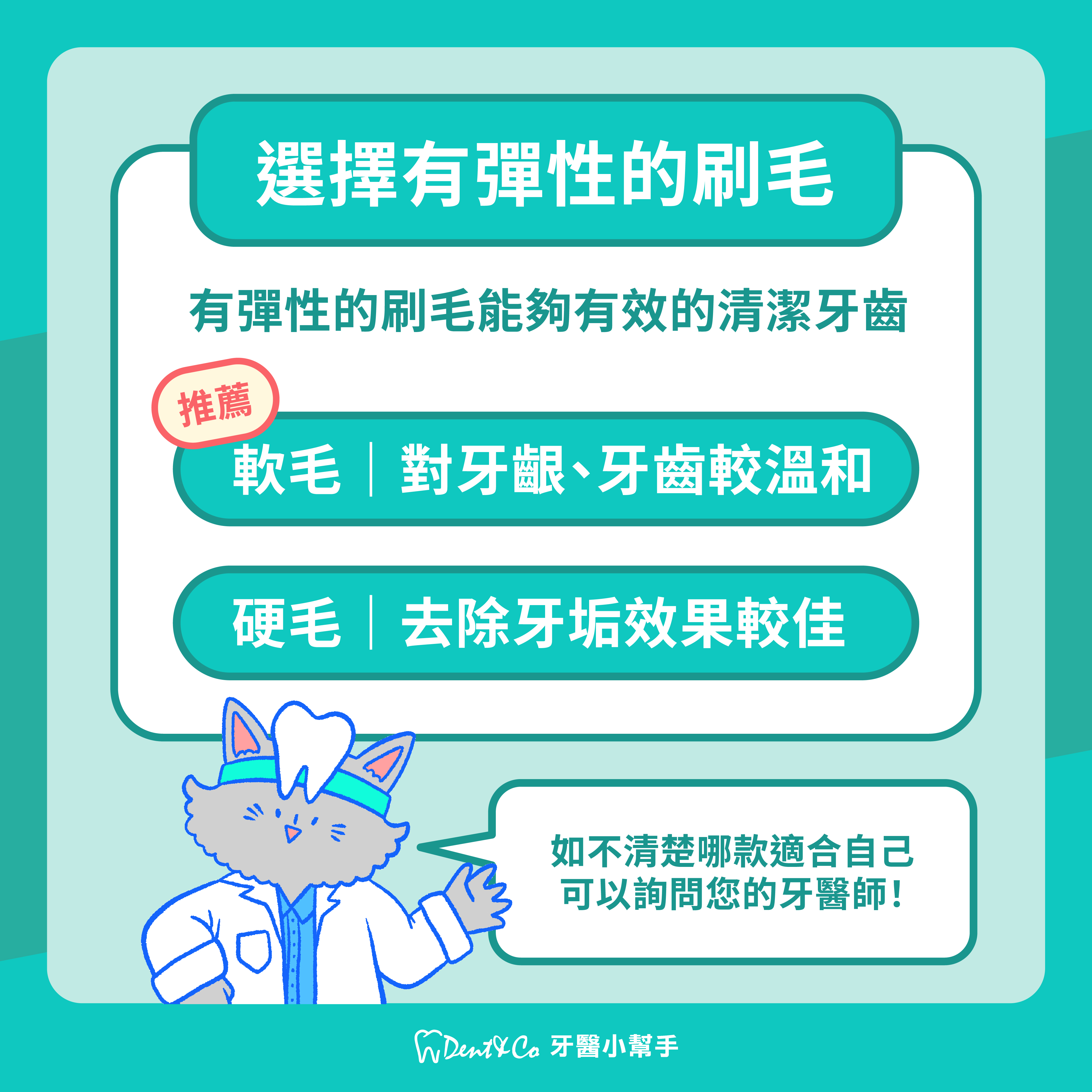 市面上販售的牙刷有多種軟硬度的刷毛,實際每種刷毛大致上對牙齒都有清潔功用,差別在於軟毛通常對牙齦與牙齒表面較溫和、硬毛對去除牙垢有很好的效果;選擇大方向是挑選有彈性的毛種,能最有效的清潔牙齒!除了個人喜好以外,也能針對自己的牙周狀況去評估刷毛,例如:有牙周病的病患,就會建議選擇刷軟毛;如果不清楚自己適合的牙刷,可以諮詢你的家庭牙醫喔!