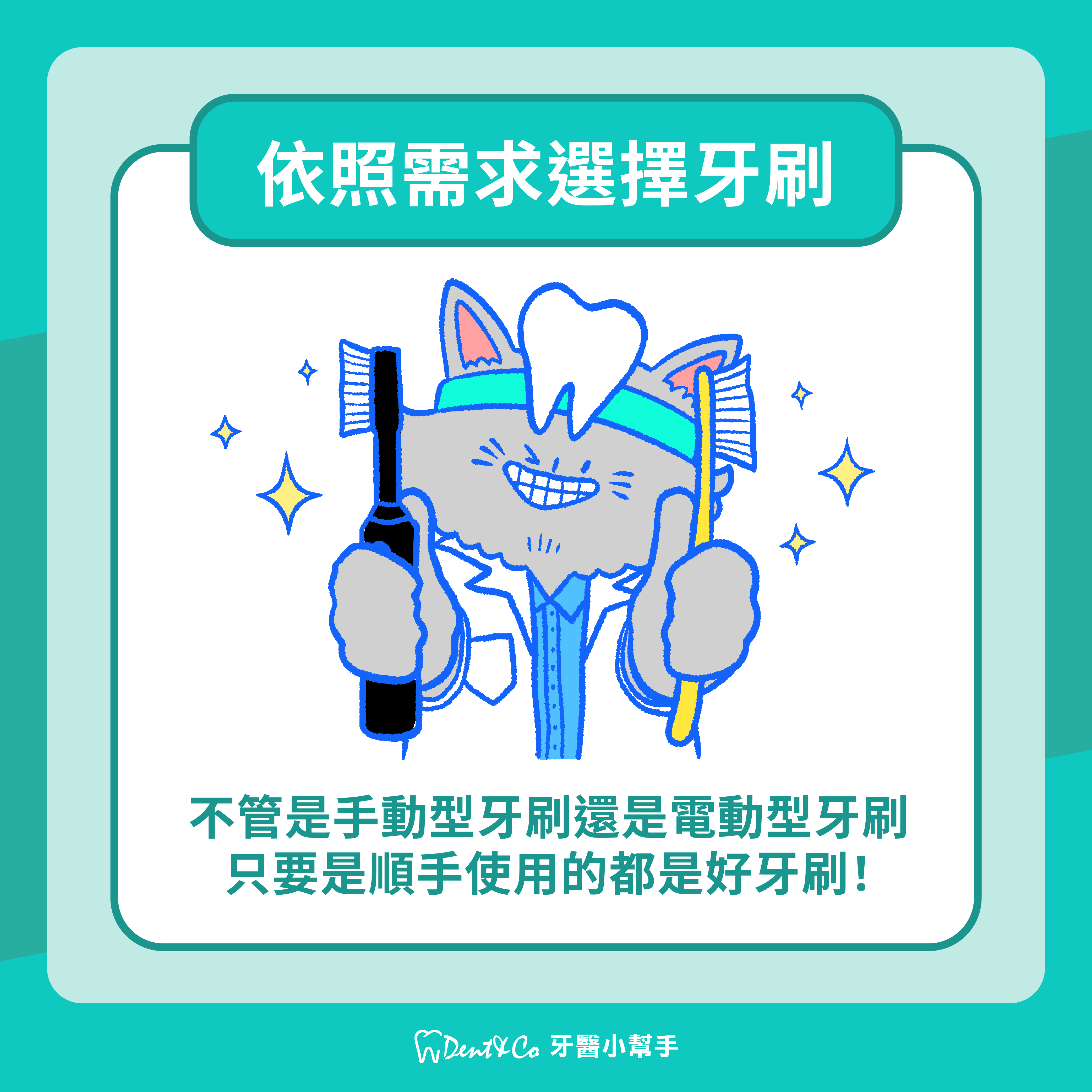 牙刷還分成 手動跟電動,其實這兩種牙刷都能達到有效清潔牙齒,追求效率的人通常比較偏好電動型牙刷,而大多數的人還是選擇手動牙刷居多。只要自己用得順手,且有維持每日2-3次刷牙習慣,就能有效維持牙齒清潔!