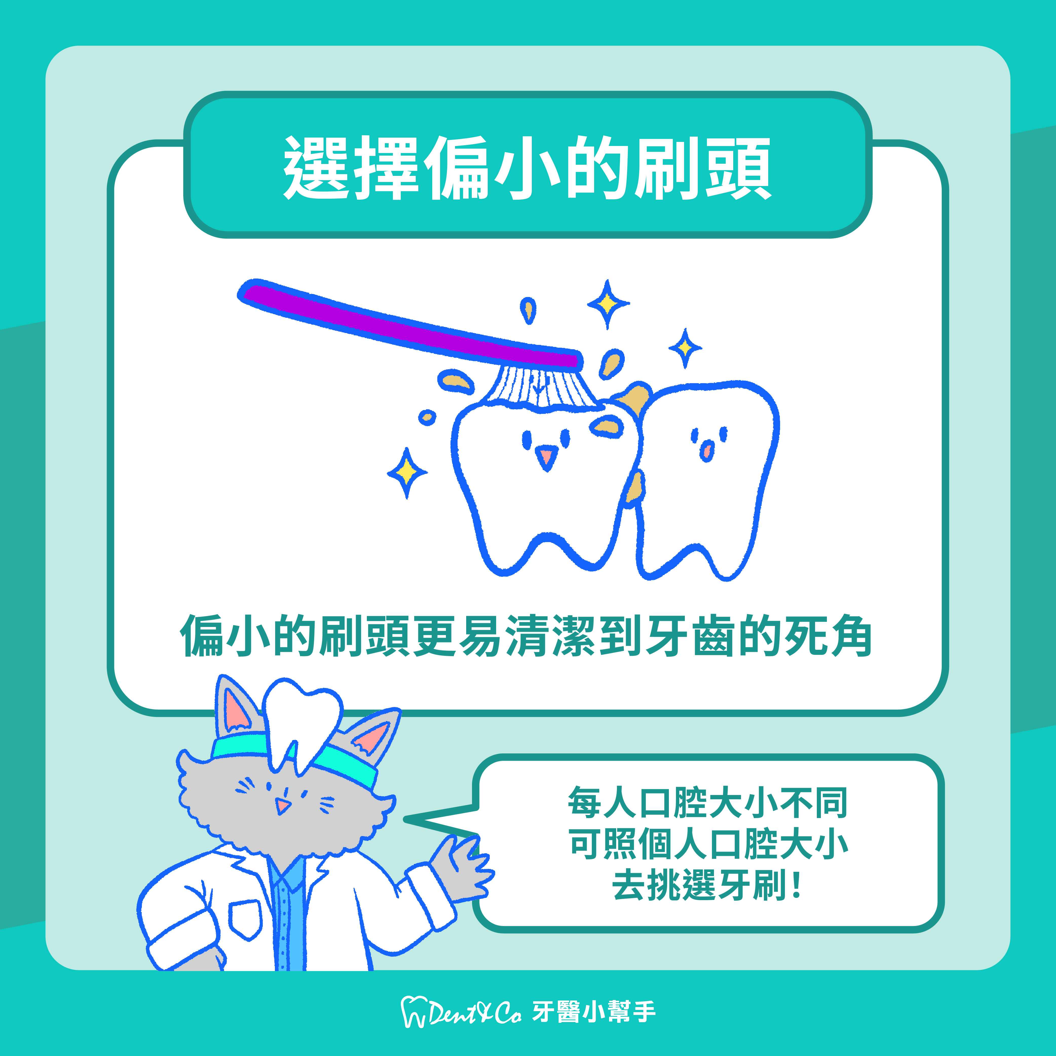 口腔內有許多不規則形狀的牙齒,常有刁鑽又難刷的角度。牙刷建議選擇偏小的刷頭,才能深入刷到牙齒後側或是背側。可以依照自己口腔的大小去挑選,刷頭比例較小的牙刷即可!