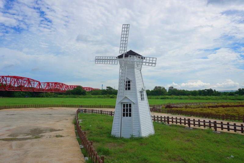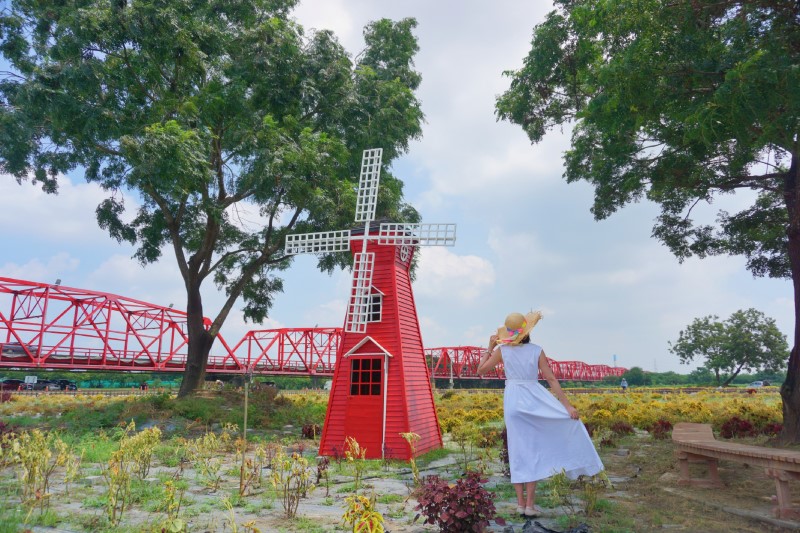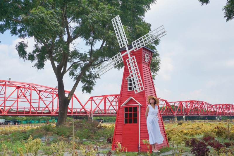 除了吸睛且愜意的雙心彩繪稻田可觀賞外,西螺大橋下更多了兩座可愛的風車裝置藝術,紅色亮眼、白色靜謐有著不同的視覺感受,也替橋下的光景增添不同的童趣在,一望無際的自然景觀也讓人可好好慢下腳步觀賞,感受這座歷史建物曾有的熱鬧風華。