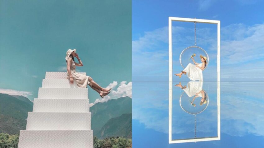 就在海崖谷附近的山度空間,在山邊打造超多夢幻的打卡點,有180度的環海美景超chill的帳篷座位區,還有一座透明圓形泡泡鞦韆,只要花50元,店家就會請專屬攝影師拍出整個景色上下倒映的天空之鏡,伴隨著花蓮晴朗的藍天白雲,整個仙氣爆表。