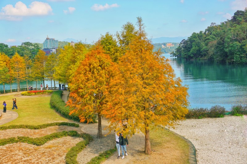 南投日月潭一年四季都有不同美景可以欣賞,秋冬時正值落羽松變色季節,這裡更有被評選為最美環湖自行車道,碧綠的湖水搭上落羽松林,湖光山色讓許多人佇足打卡拍照,美景宛如明信片上的歐洲小鎮風情,在向山遊客中心下方還有一座婚紗廣場,也能欣賞整排的落羽松林以及雙心花圃,預計這樣的美景可以持續至明年1月左右,不妨安排一下來到南投日月潭賞落羽松。
