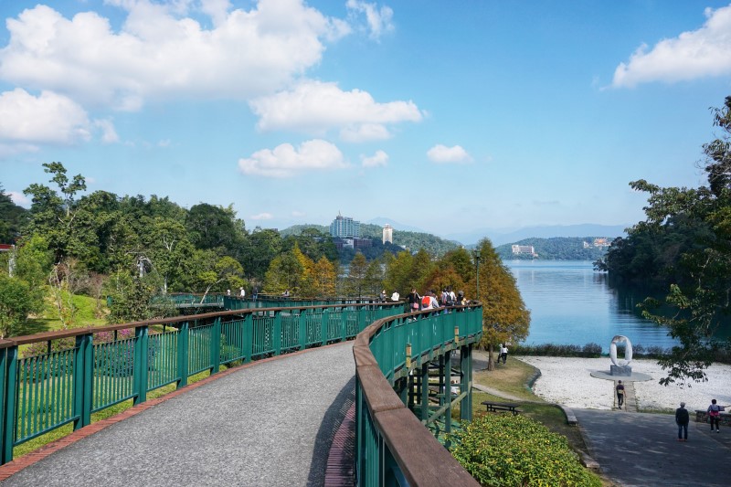 在遊客中心一旁的天空步道及400公尺長的「水上自行車道」也是絕佳的賞景地點,騎著自行車沿著湖畔欣賞落羽松,湖面倒映著朦朧美景超愜意,途中也可以在景觀平台稍作休息,尤其是在靠近日月潭大飯店的路段,也有一整排變色的落羽松林可以拍照打卡,在沒有圍欄的水社壩路段也是相當推薦的駐足點,可以更近距離的欣賞湖畔景致,每個角度都很好拍,來到這裡一定要拍個夠。