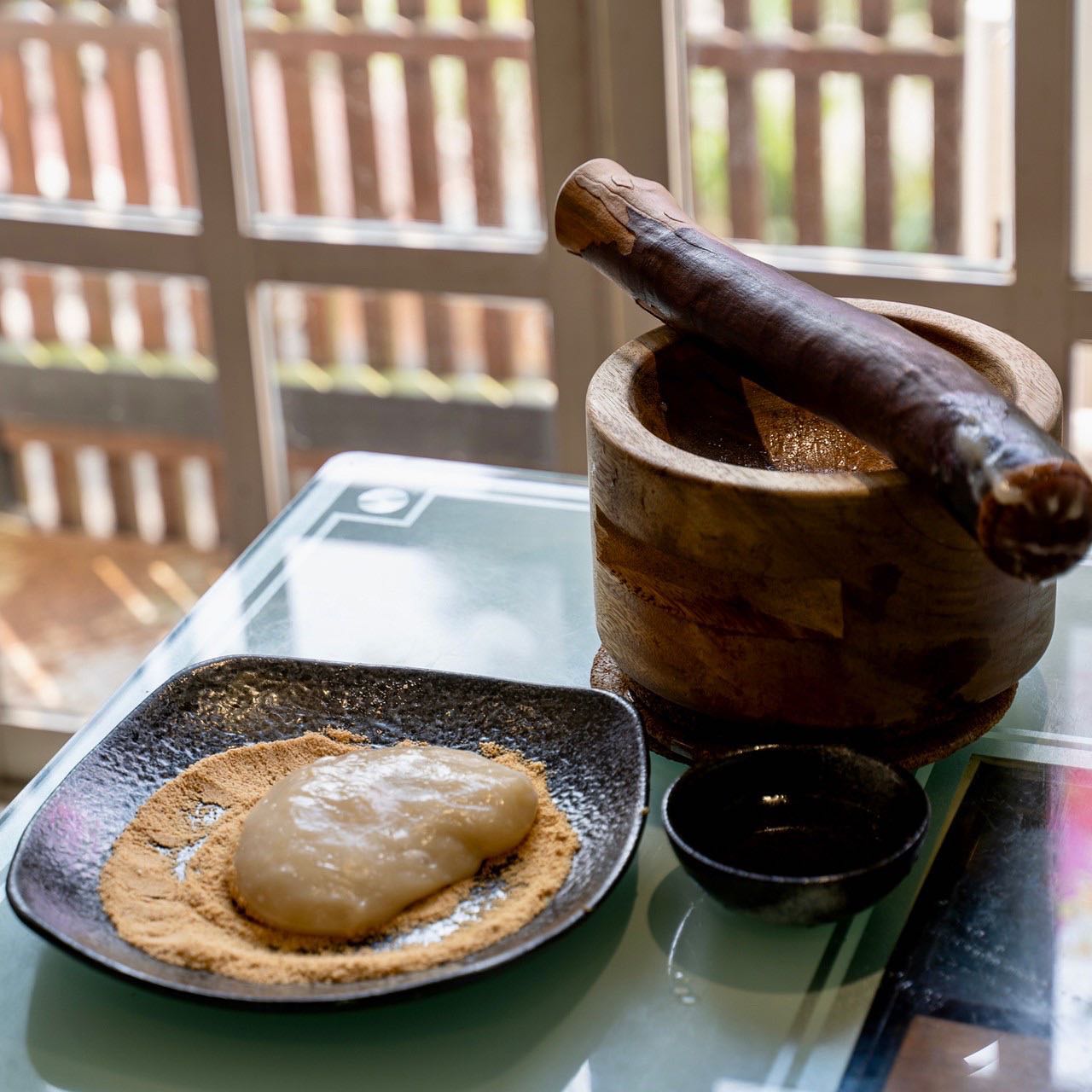 走出自己特色的十六份人文茶館,與其他勝興老街的店家不太一樣,他們主打的是擂茶+搗麻糬的雙人DIY套餐。利用動手搗麻糬吸引顧客,過程中有趣又有成就感,好不好吃已是其次。麻糬的口感就是客家麻糬的超Q彈咬勁,是值得一試的體驗喔!