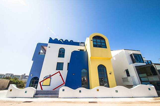 水藍舍~水藍色!與澎湖的藍天白雲相互輝映的水藍色建築,就是這棟民宿的最大特徵。童趣可愛的水藍、純白與鵝黃三色,構築成為青春活潑的城堡外觀,讓人還沒進入民宿,就已經感覺到屬於澎湖的熱情洋溢。